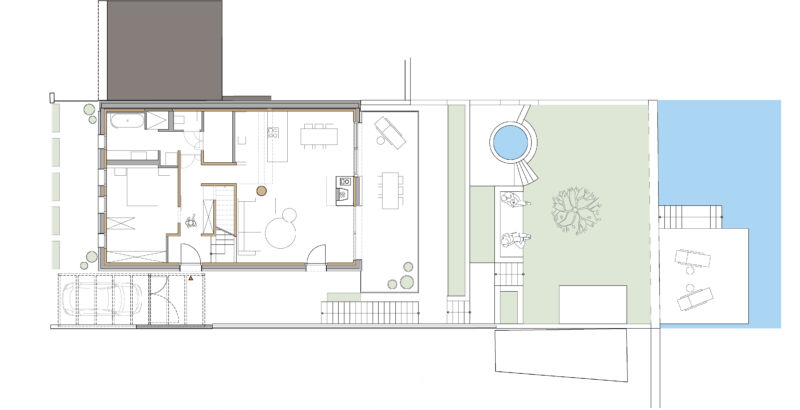 Der Außenraum wurde terrassenartig zum Wasser hin gestaltet. Natursteinmauern, Holzdecks und Grünflächen gliedern den Garten und schaffen unterschiedliche Aufenthaltsbereiche – von der Terrasse mit Ausblick zum geschützten Sitzplatz bis zur Badeplattform am See.