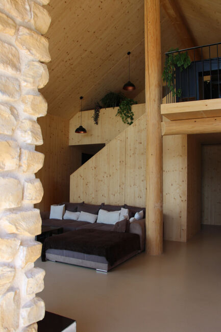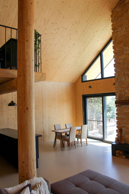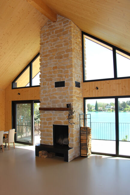 Das Gebäude wurde als Holzhaus in Brettsperrholz mit markantem Natursteinkamin konzipiert. Große Glasflächen öffnen den Innenraum zum See und lassen das Panorama Teil des Wohnraums werden.