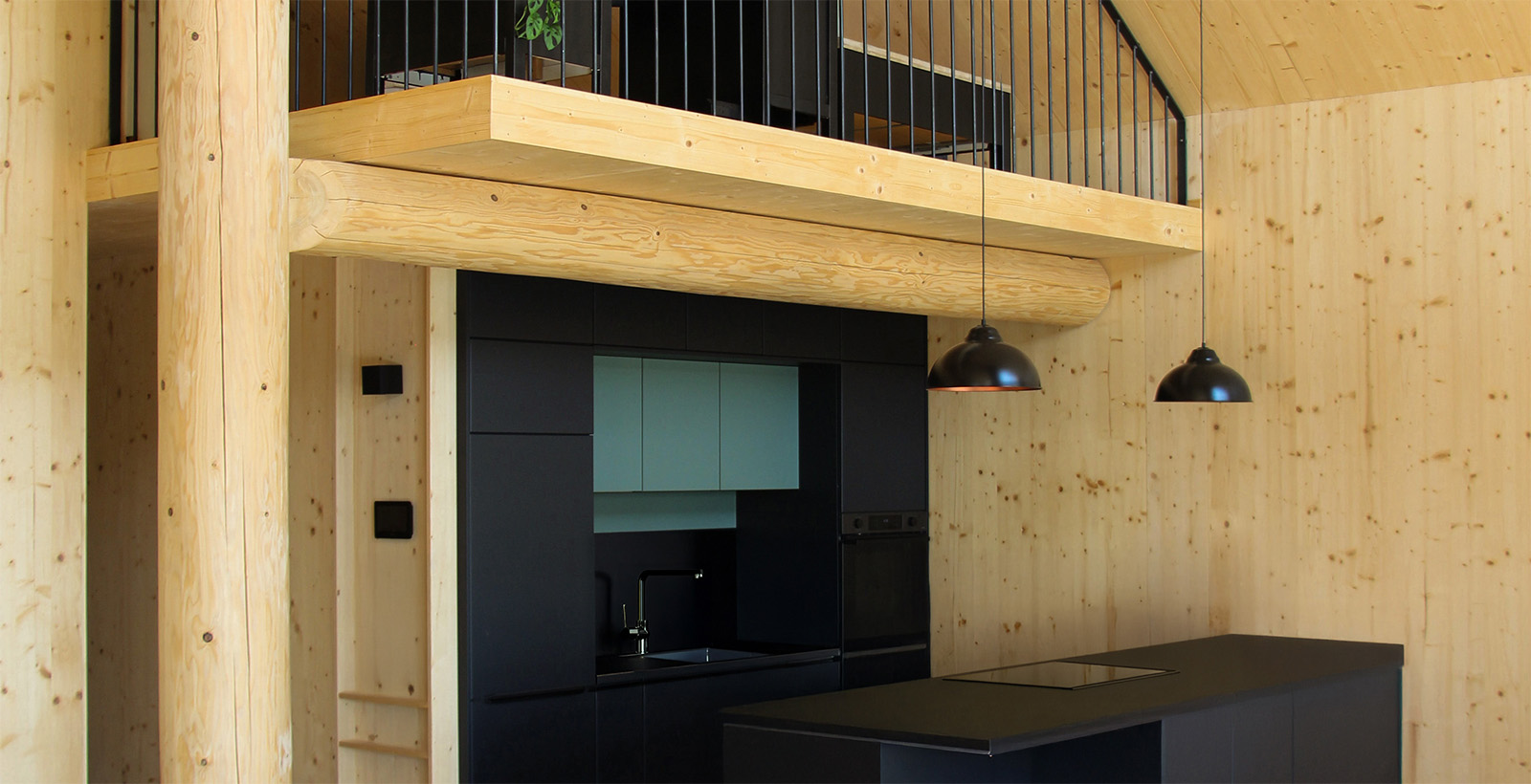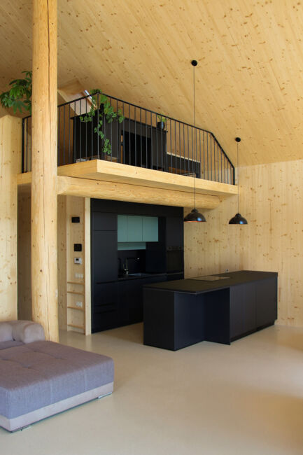 Im Erdgeschoss sorgt der offene Grundriss für fließende Übergänge zwischen Kochen, Essen und Wohnen. Die Kombination aus warmen Holzoberflächen, Naturstein und schwarzen Detailbereichen schafft eine behagliche und zugleich moderne Atmosphäre. Über dem Wohnbereich bietet eine offene Galerie zusätzlichen Raum und unterstreicht die großzügige Raumwirkung.