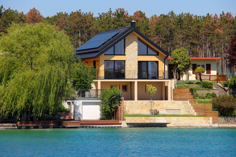 Die Gestaltung folgt der Idee, ein weitgehend energieautarkes Wohnhaus mit natürlichen Materialien zu entwickeln, welches Innen- und Außenräume verbindet und die besondere Lage am Wasser inszeniert.